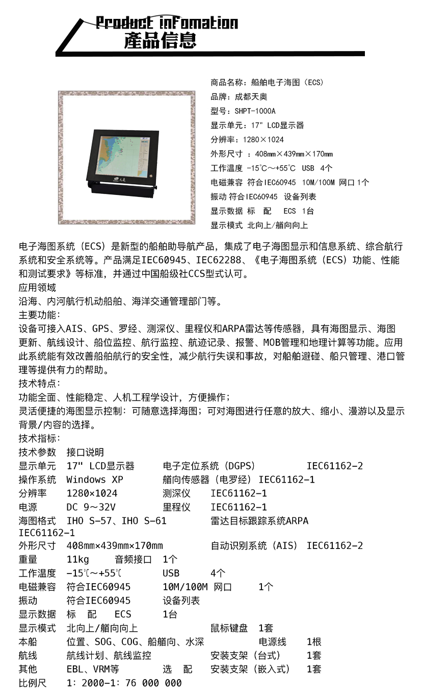 | 顯示單元: | 17英寸 | 電子海圖庫: | S-57海圖/S-61海圖 |