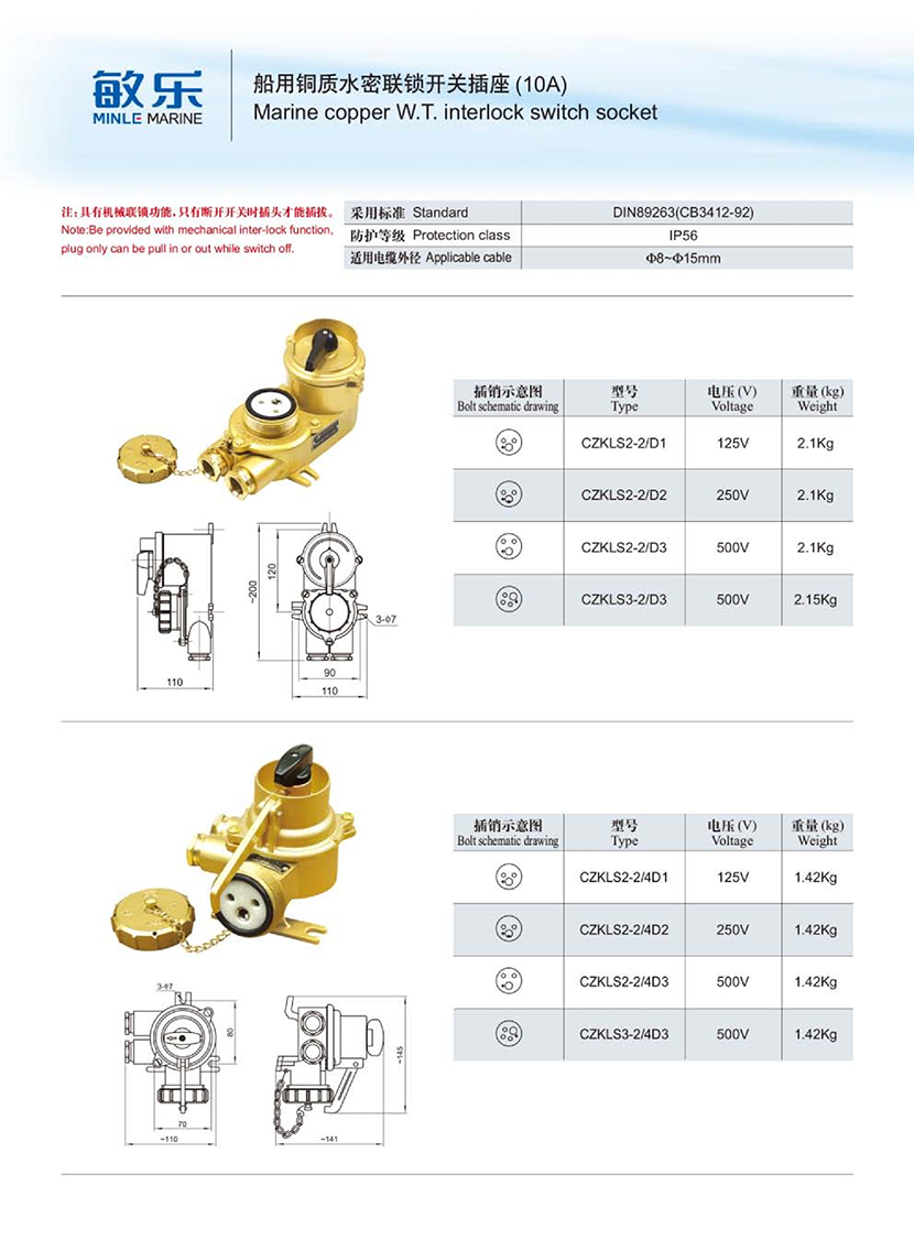| 船用銅質水密聯(lián)鎖開關插座(10A) | |||