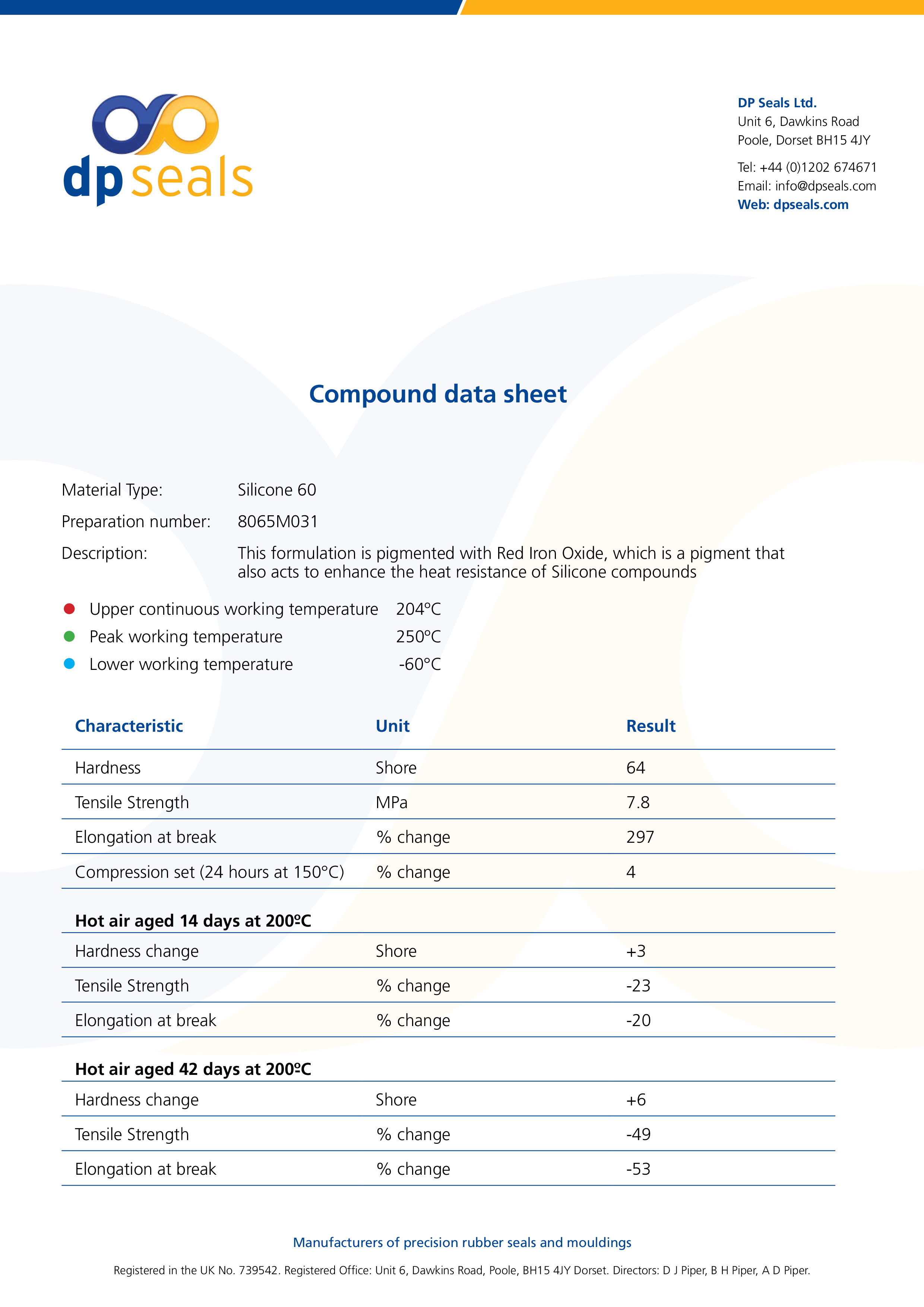壓縮率: 4%(24 hours at 150oC) 超高溫耐受水平: (200oC熱空氣環境下連續工作14天)硬度 +3Shore;抗張強度 -23%;斷裂伸長率 -20% ;(200oC熱空氣環境下連續工作42天)硬度 +6Shore;抗張強度 -49%;斷裂伸長率 -53%